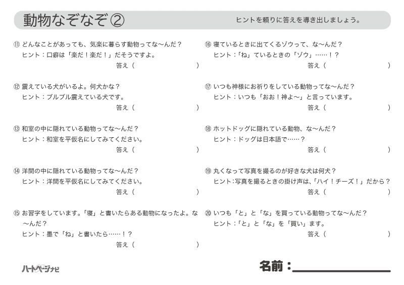動物なぞなぞ 小学生向け-幼児向け 動物なぞなぞクイズ 100問 知育ことば遊び 「動物なぞなぞ幼稚園」は、遊びながら言葉の力を育み、生き物の特徴や生態などを学べる知育サイトです。なぞなぞは、楽しみながら物事を説明する力が身につき、言葉を使って考える練習になります。 動物なぞなぞ① ① 何を食べても「おいしい!」と言う動物ってな~んだ? ヒント:「おいしい」には他にも言い方がありますね。 答え( ) ② お正月になると出てくるゾウって、どんなゾウ? ヒント:お正月の食卓に出てきます。